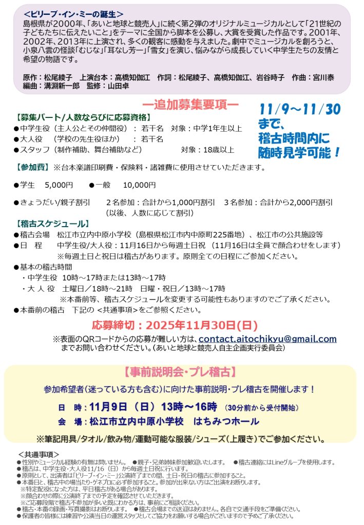 この度あいと地球と競売人自主企画実行委員会は、13年ぶりに! 復活公演! ミュージカル「ビリーブ・イン・ミー2026」を手がけることになりました。✨👏✨👏✨👏