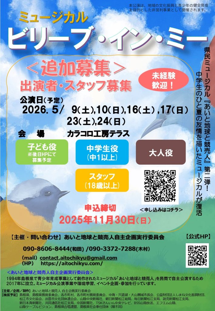 島根県が2000年(平成12年)、「あいと地球と競売人」に続く第2弾のオリジナルミュージカルとして「21世紀の子どもたちに伝えたいこと」をテーマに、全国からオリジナル脚本を公募し、応募作品の中から大賞に選ばれた作品が「ビリーブ・イン・ミー」(原案:松尾綾子氏)です。